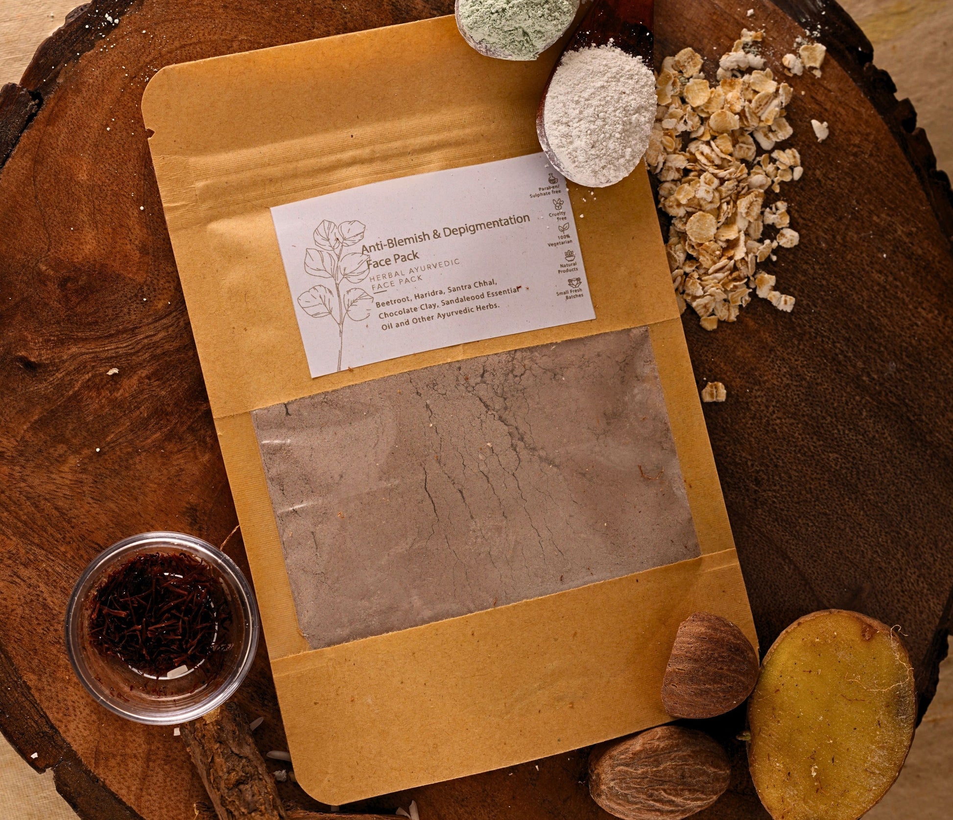 Beetroot, Haridra, Santra Chhaal, Chandan, Chocolate Clay, Sandalwood Essential Oi etc