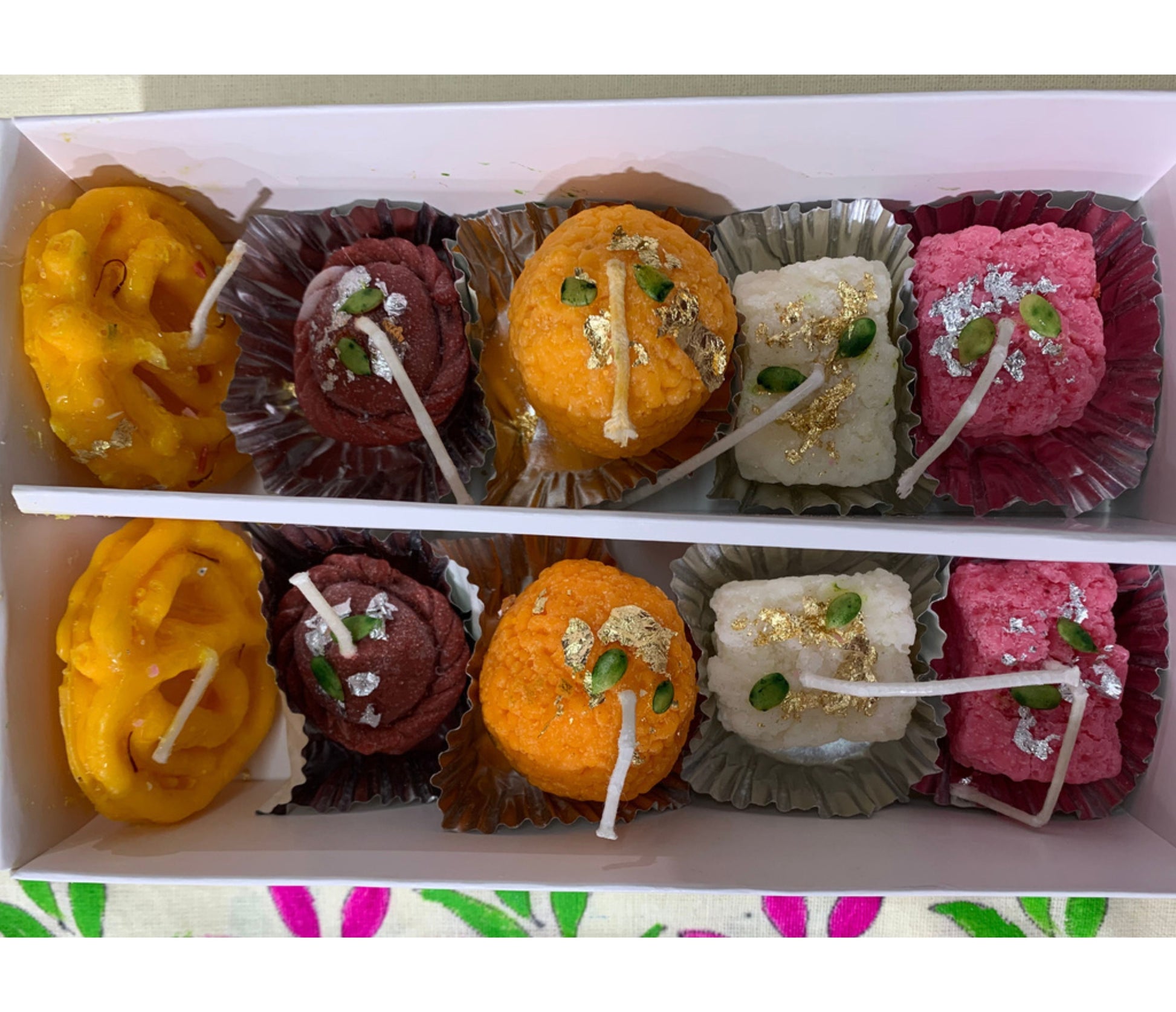 Mix Mithai Candle Box contains 2 pieces each of Jalebi, Gujia, Laddoo, Mava Burfi, Strawberry Barfi