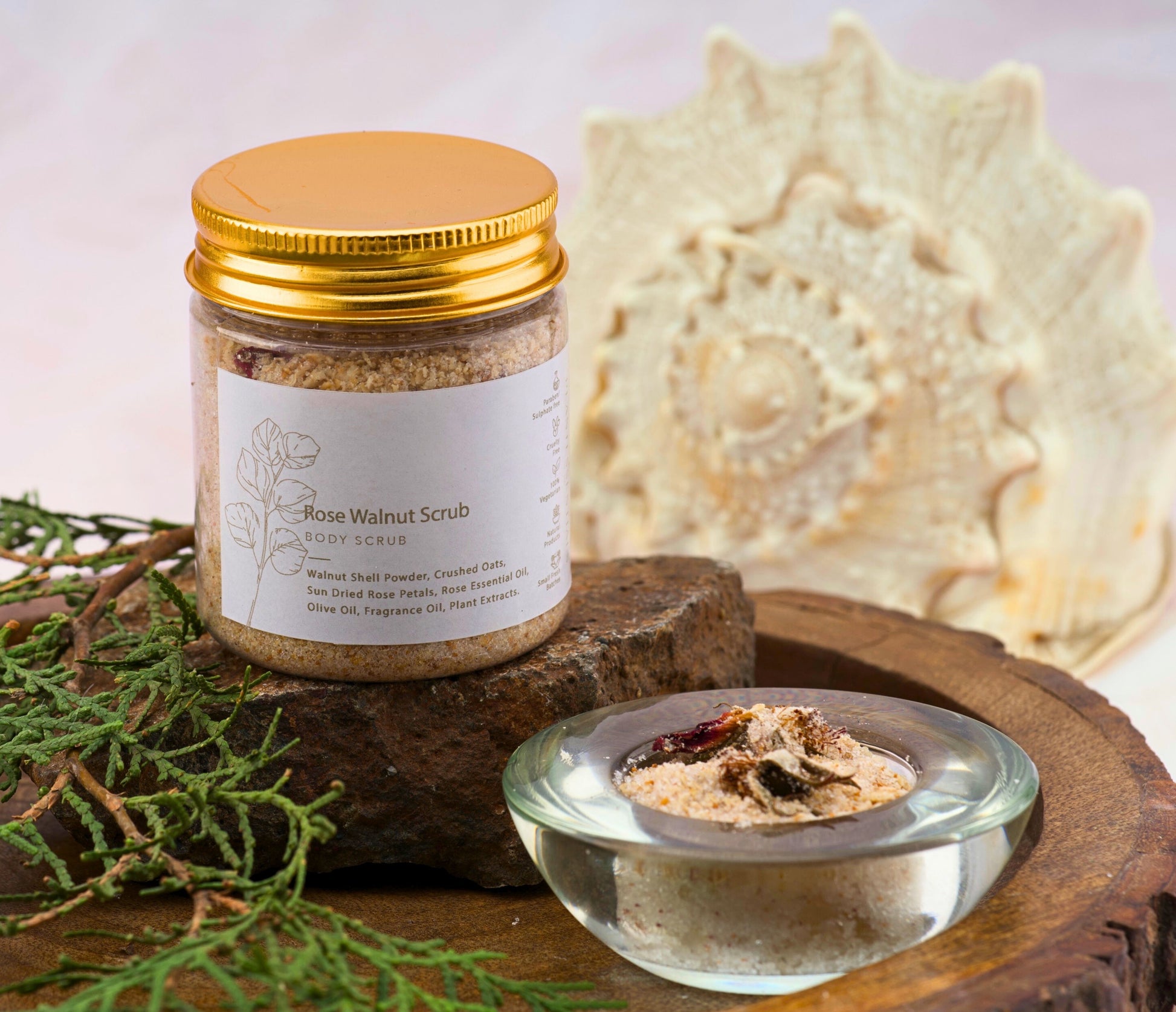 rose scrub, walnut shell scrub, olive oil, essential oil etc
