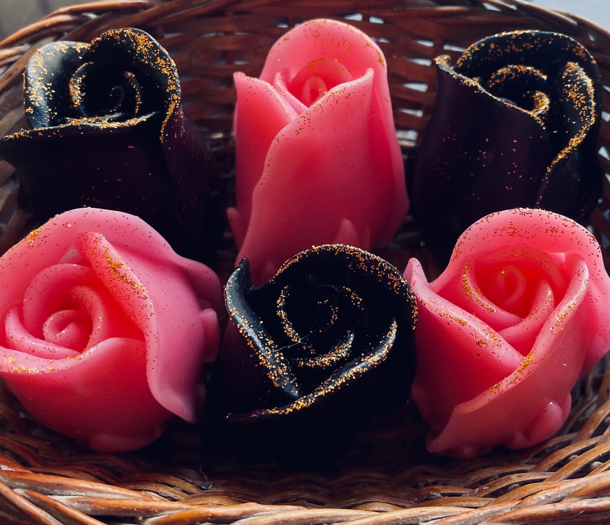 A set of 6 (3 pink & 3 black) rose soaps, that smell like freshly plucked roses.