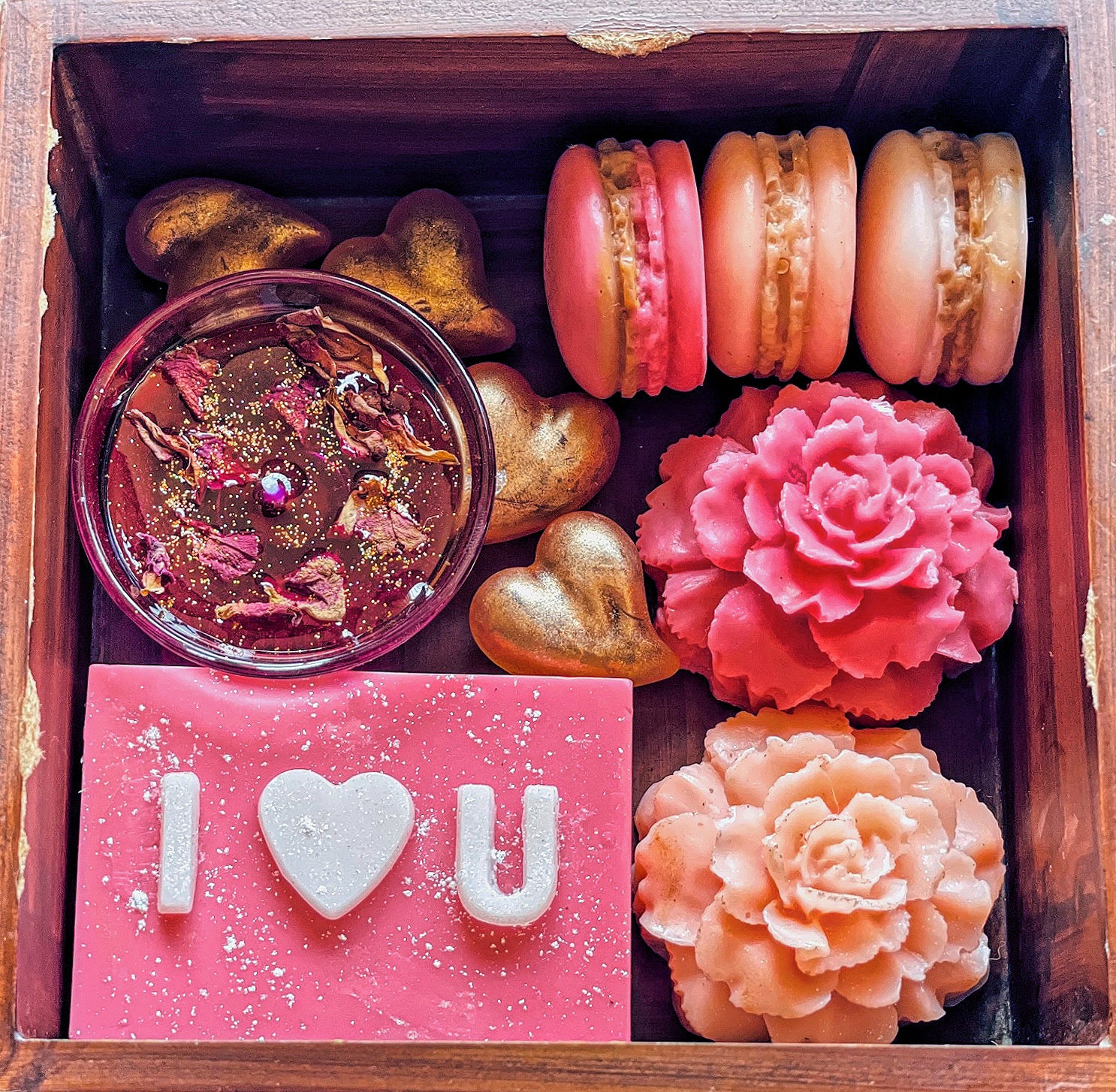 Indulge in a pampering experience with our Valentine's Champagne Pink Hamper. Treat yourself or your loved one to a selection of exquisite soaps, including macaroon, carnation flowers and mini heart varieties, accompanied by a beautifully scented rose candle. Elevate your self-care routine with this indulgent and romantic gift.
